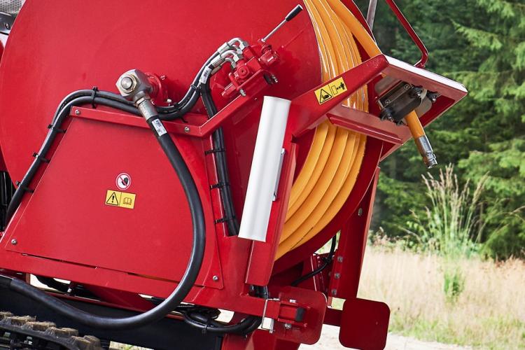 Easily manage the Bucher Remote Reel with the control panel mounted on the back. The control panel manages, among other things, the automatic hose guide, the speed and the width of the undercarriage belts.