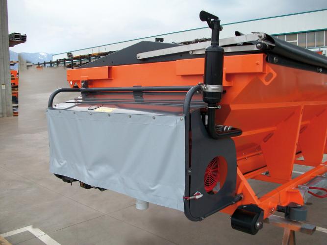The pre-wetting system is equipped with a volumetric pump directly coupled to the hydraulic motor, which is maintenance free. The Nitrile rotor does not need internal washing (only at the end of the season). Tanks constructed from sturdy and light-weight recyclable polyethylene. Solid/liquid ratio is regulated directly from the control box in the driver’s cabin.