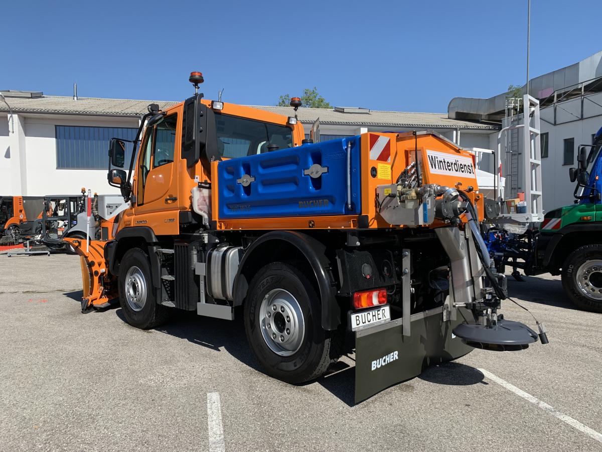 Volumetric pump with salt solution tanks. The liquid is injected directly into the spreading disc