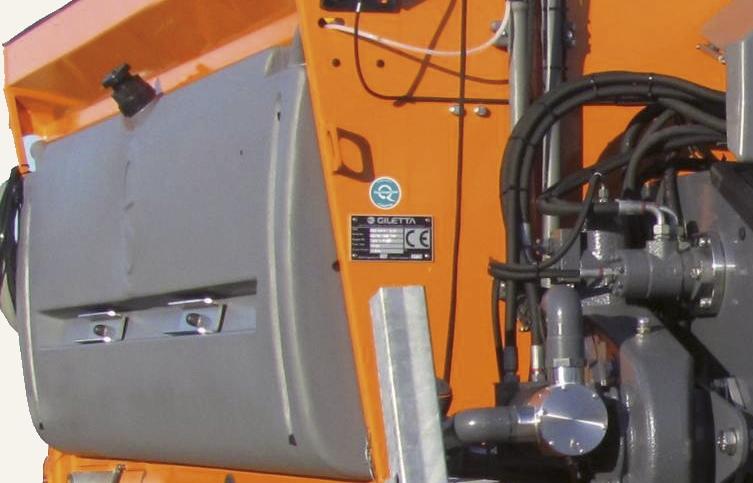 Il dispositivo umidificatore è dotato di una pompa volumetrica flangiata direttamente al motore idraulico, esente da manutenzione. La girante in Nitrile non richiede lavaggi interni se non a fine stagione. I serbatoi laterali sono in polietilene rotazionale di notevole leggerezza e robustezza, oltre che completamente riciclabili. Il rapporto solido/liquido viene regolato elettricamente dal quadro comando in cabina