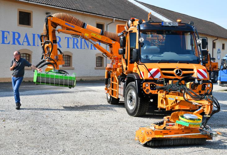 Am Standort Maxlrain wurden die Unimog-Geräteträger mit den Anbaugeräten von Bucher Municipal Wernberg und Mulag dem Fachpublikum präsentiert.