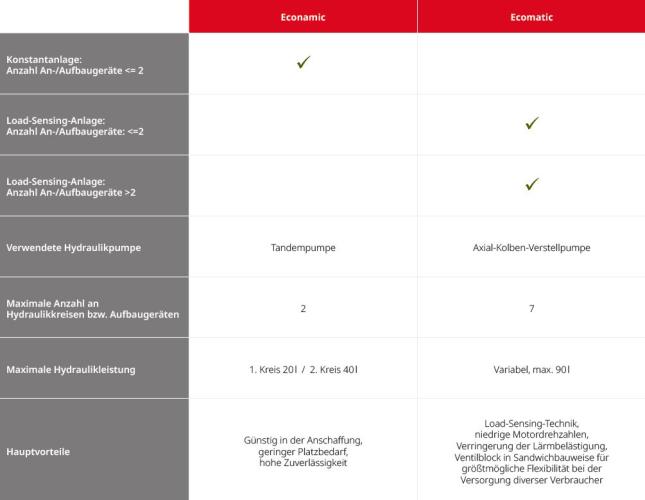 Die Bucher Kommunalhydraulik-Anlagen sind wahlweise als konstante Hydraulikanlagen mit der Bezeichnung „Econamic“ oder als Load-Sensing-Hydaulikanlagen mit dem Namen „Ecomatic“ lieferbar. Die Econamic-Anlage zeichnet sich durch hohe Wirtschaftlichkeit und niedrige Unterhaltskosten aus und die Ecomatic-Anlage ist mit Proportionalventiltechnik ausgestattet.