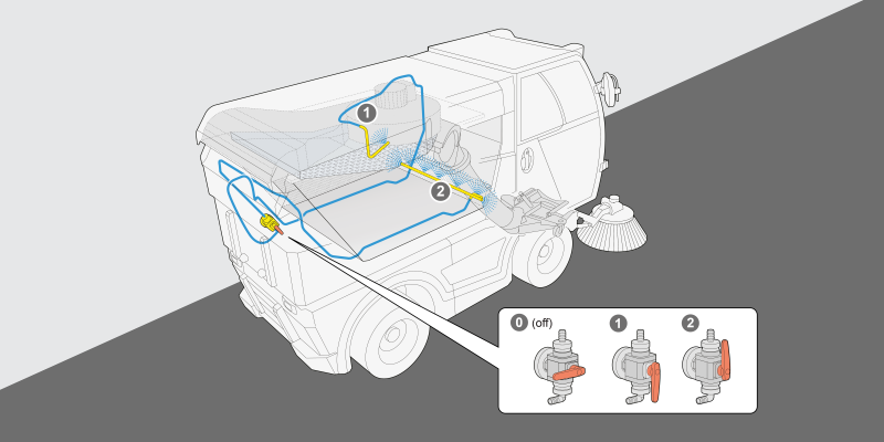 Leveres med et fuldt udstyret førersæde med nakkestøtte, der ikke blot tilbyder en komfortabel køreoplevelse, men også en ergonomisk arbejdsplads. Vi mener, at alle chauffører skal nyde at arbejde med vores fejemaskiner, så vi har introduceret en kabine med gennemgående førerhus, blødt styretøj og et armlæn med ergonomisk perfektionerede betjeningselementer. Et fantastisk udsyn fra kabinen sikres ikke kun af den store, opvarmede frontrude og alle glasdøre, men også af kameramulighederne, hvis billeder kan vises på Smart-Con- og CSense-skærmene. Sikkerhed er selvfølgelig afgørende. Fra 3-punktsselen til den forbedrede belysning af fejeområdet - der sikrer et sikkert overblik og synlighed for tredjeparter - er det vores pligt at passe på omgivelserne.