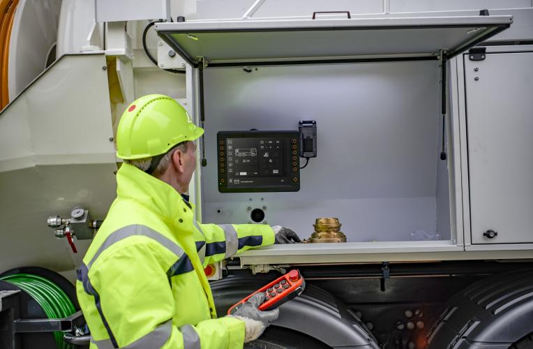 Der er ingen grund til at gå frem og tilbage for at betjene spulefunktion, vakuumpumpe, slanger, teleskoparm eller motorens omdrejningstal. Betjen alle disse funktioner, mens du står ved siden af kloakdækslet.