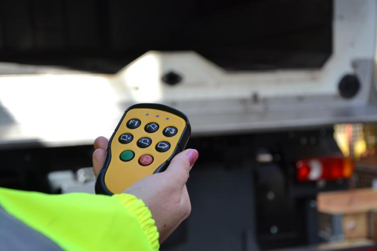 The MaxPowa V65e is equipped with a radio controlled remote pendant allowing the operator to walk completely around the sweeper without having wires to contend with.