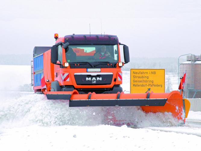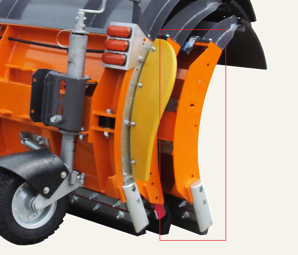 Highway snow plough for clearing at high speed. The patented concept consists of a rigid plough part and one or two extendable elements. These can be extended on both the left and right, even whilst driving and allow a clearing width of up to 6030mm at a 32° inclination.