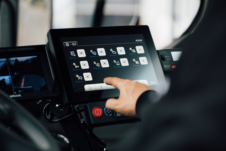 The ergonomic door controller can be used for all sweeping operations, brush position, pressure, speed, nozzle aperture, engine revs and water jets. A heavy duty pause button allows the operator to lift all the sweepgear until depressed again. This allows the operator to change from sweeping to transit in a quick and easy way. Usability has been enhanced with a full LED halo surrounding each individual button which illuminates when active for ease of identification.