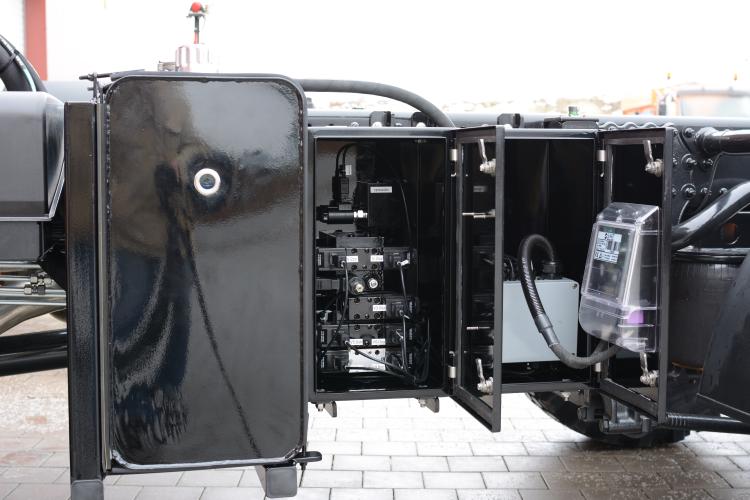 Econamic hydraulic systems deliver constant volumes of oil to a maximum of two different hydraulic circuits. For instance in winter operation a snowplough and a spreader unit can be supplied. A tandem pump directly flanged on to the engine power take-off drive of the vehicle then supplies the front plough with a maximum of 20 litres of hydraulic oil, and the second circuit for the spreading unit with a maximum of 40 litres. Each of the two hydraulic circuits is thus fully dedicated to its respective consumer. Of course the Econamic municipal hydraulic system is also available as a single-circuit hydraulic system. The valve block and the black box for the controls are installed in an enclosed equipment cabinet. On request, a combination equipment cabinet with an integral hydraulic tank is available.