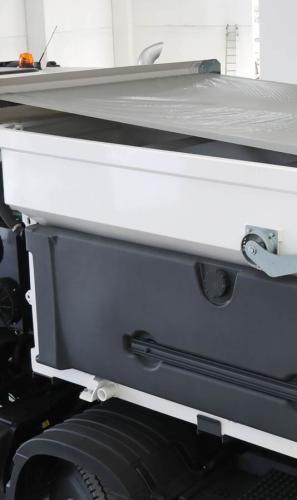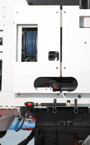The water delivery system includes all the necessary parts to precisely dose and control the water addition to the mix, emphasising the importance of the Water / Cement ratio: There are two lateral water tanks with a capacity of 2,400L. The gear pump (180l/min) is hydraulically operated through a proportional valve with closed-ring dosage control. There is an indicator and sensor level meter, a A DN50 filling pipe and 2 tank caps for water loading system.