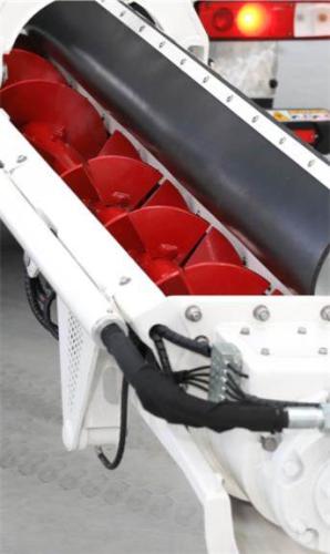 The 2500mm mixing auger has been designed to ensure a high mixing capacity without compromising the maximum flow rate and homogeneity. The auger is divided into small sections to enable the material to be correctly mixed. When replacing parts, you only need to replace wear parts and not the whole auger assembly. The rear end assembly also includes the orientation system assembly which is operated from a hydraulic distributor giving you working aplitude of 125° with a maximum radial working distance of 6000mm.