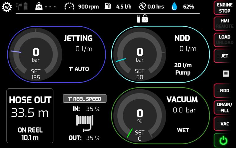 19m storage capacity for the 6” vacuum hose. Hydraulic rollers automatically feed the hose in and out, reducing manual handling. Ideal for deep pits and wells. High-speed debris transport with minimal blockages. Easy top-tank inspection.
