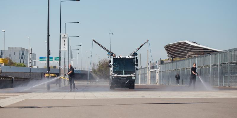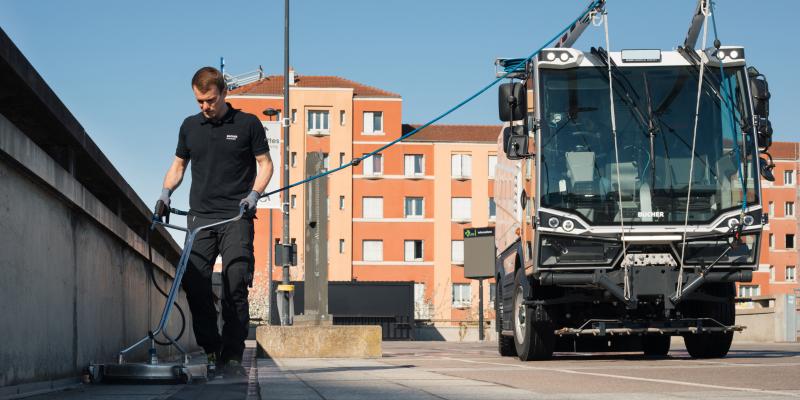 The CityCat WR50 can be equipped with a 2nd boom with automatic 15m hose and hand lance, allowing 360° cleaning around the washer.