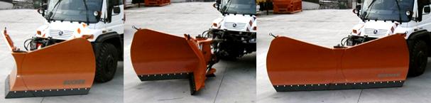 Universal snow plow with variable positions. Suitable for clearing heaps of snow, for widening out or pushing snow away. Equipped with mobile wings to take three different positions: V-plow position, snow plow position and shovel position to push snow.