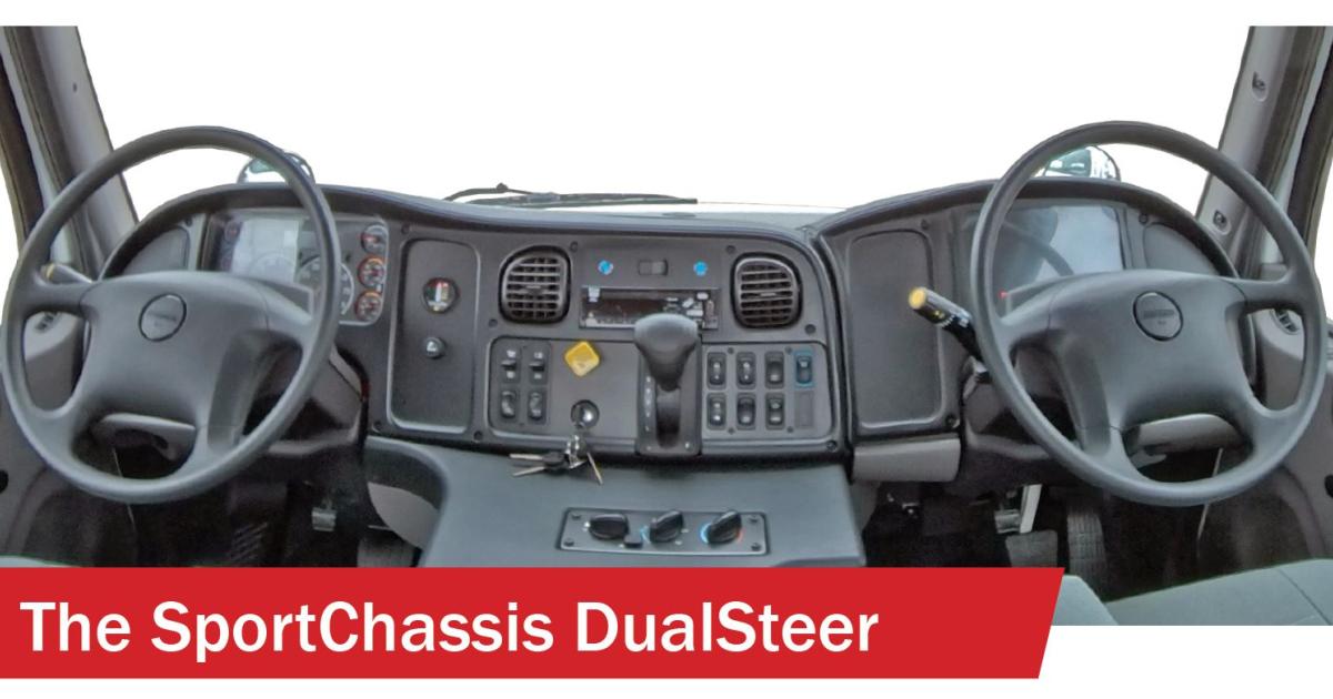 The DualSteer is built at the SportChassis OEM vehicle manufacturing facility on a Freightliner M2106, and comes standard with independent left and right-side driving positions.