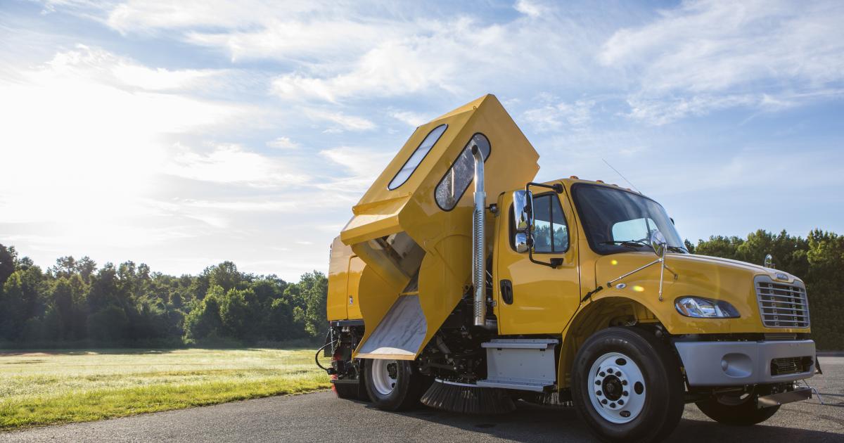 The MaxPowa E35m mechanical sweeper is mated with a Freightliner's superior M2 Class 7 chassis pairs perfectly with Bucher's mechanical street sweeper.