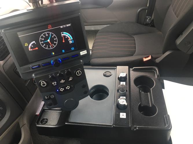 The in-cab center console featuring cup holders and USB charging points can be adjusted to suit the operator's preference. The 7” color JVM screen is mounted on an articulated arm allowing tilt angle and rotation to adjust without the need for any tools. The JVM has a wide range of settings that can be tailored to suit the operational needs.